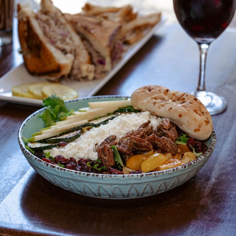With chicken or pork souvlaki, field green salad, beets, vine ripened tomatoes, cucumbers, goat cheese, oregano and caramelized pecans served with Greek dressing.