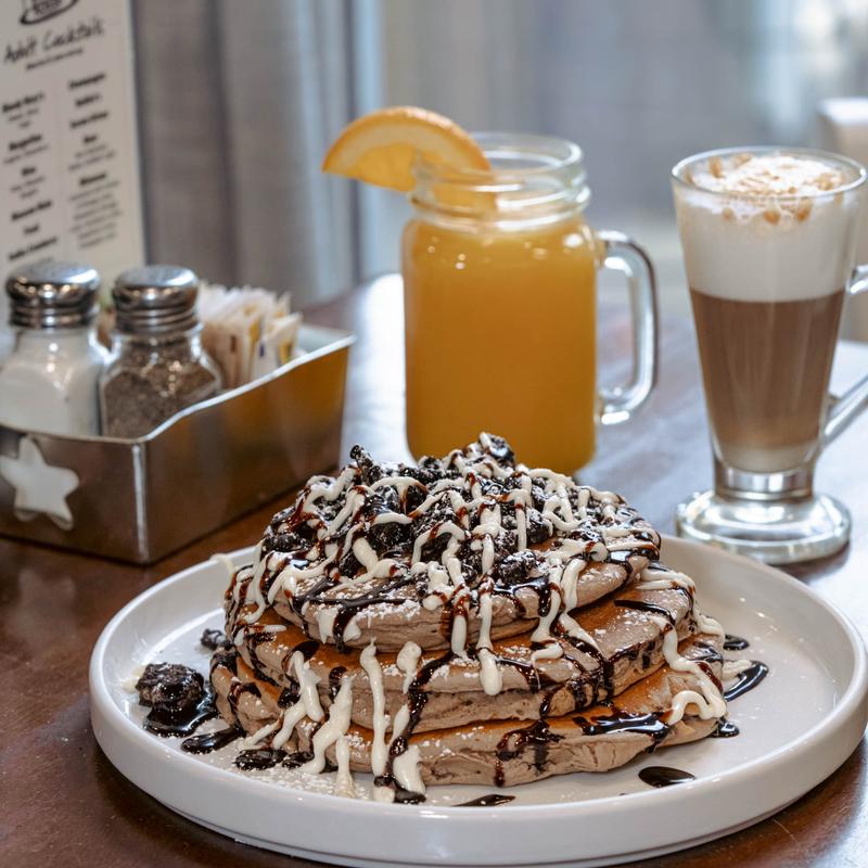 Oreo-infused pancakes stuffed with our homemade cheesecake mix, topped with mini-fried pancake Oreo balls.