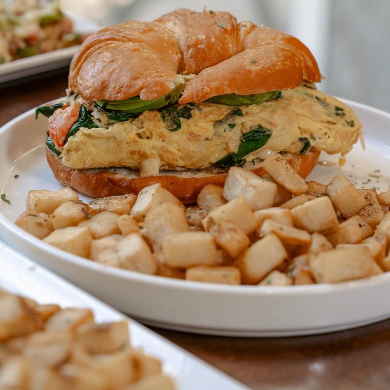 Brioche bun, choice of bacon, sausage patties, or ham topped with scrambled eggs & sharp cheddar. Choice of cubed potatoes or fruit.