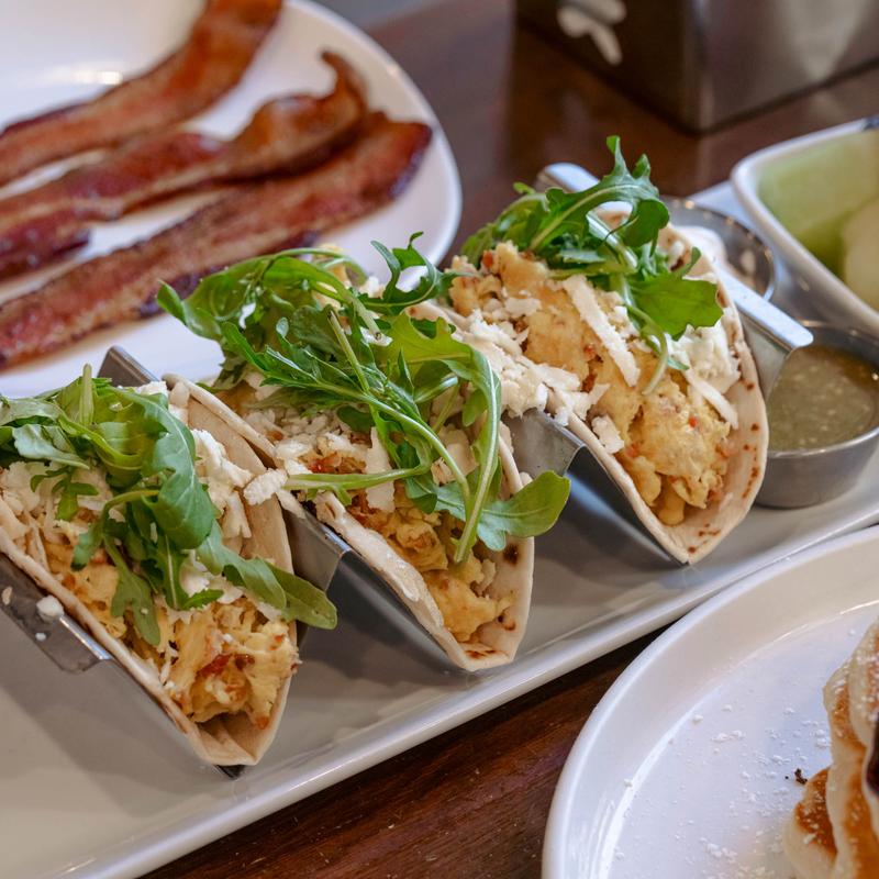 3 flour tortillas, scrambled eggs, queso fresco & baby arugula. Choice of chicken chorizo or bacon.