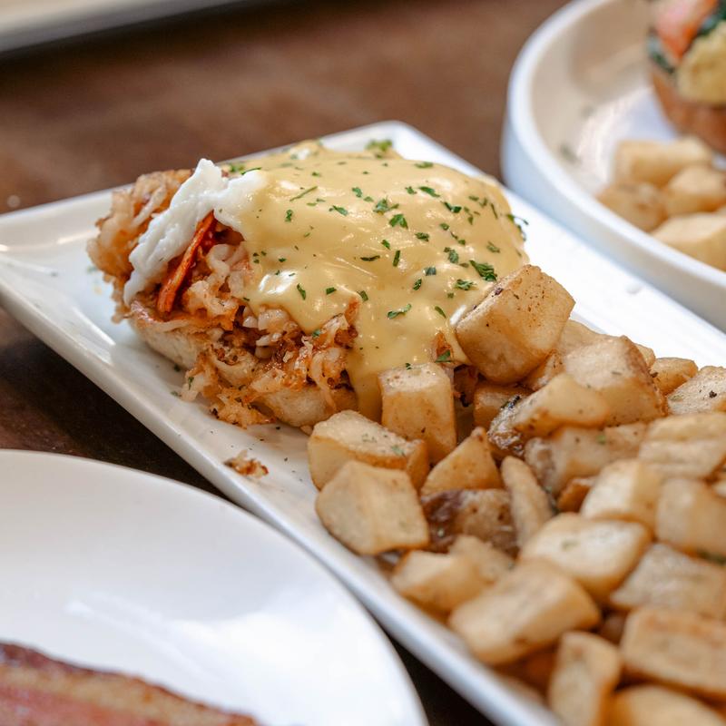 Smoked salmon, tomato on a toasted bagel topped with a lemon dill Hollandaise.