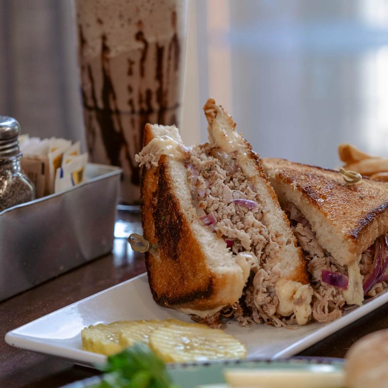 Pulled pork, pit ham, Gruyere cheese, mustard and mojo pickles, pressed on our famous Sammy Tuscan potato bread. Served with your choice of fries or fruit.