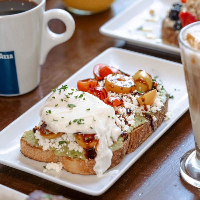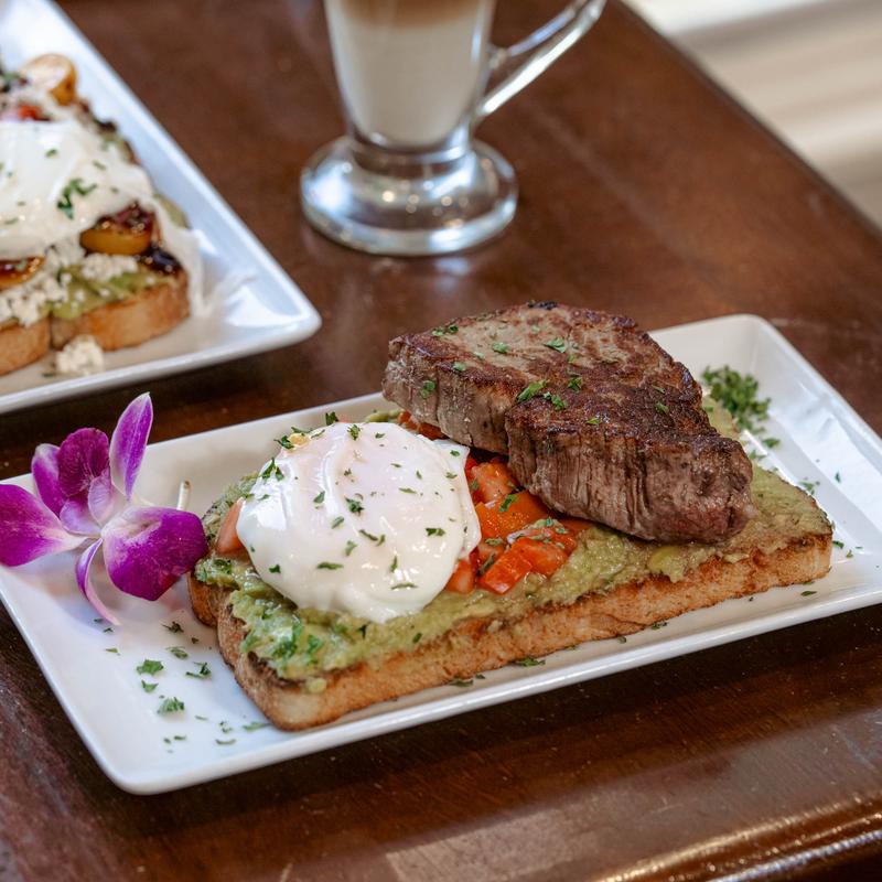 Rustic Italian sourdough with smashed avocado spread, sliced filet mignon with cherry tomatoes, and a choice of egg. Choice of cubed potatoes or fruit.